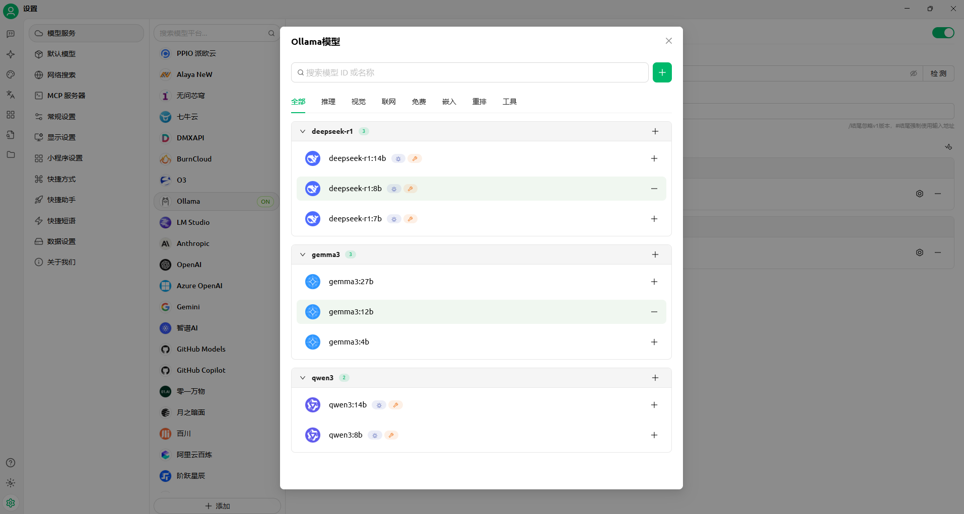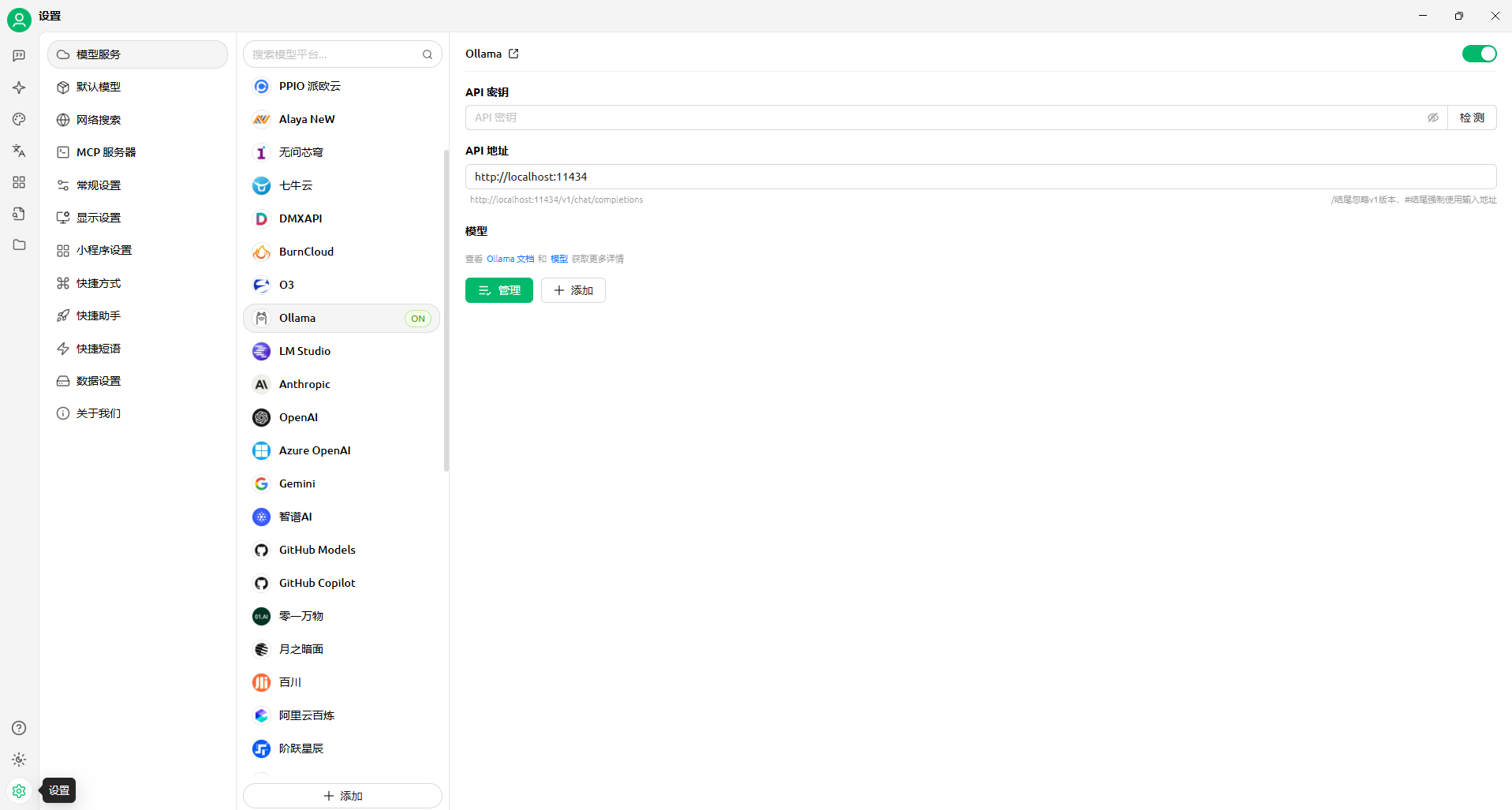 下载安装后,我们点击设置,找到Ollama➡管理➡添加AI模型