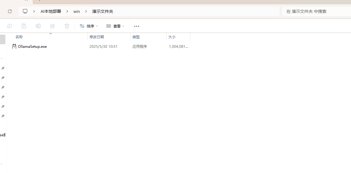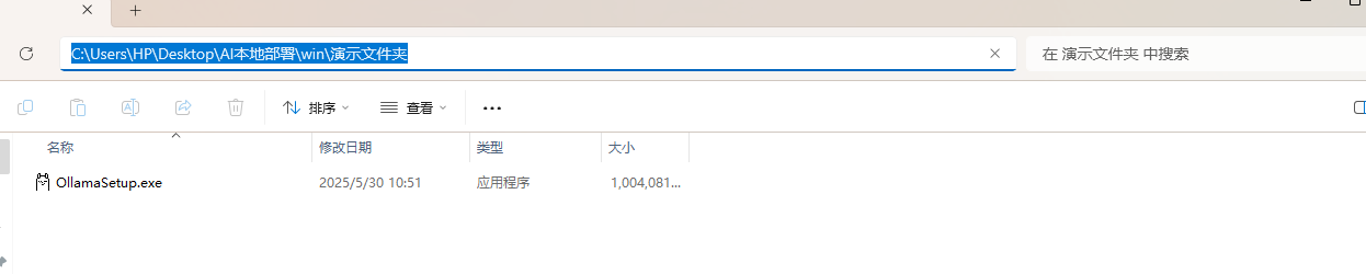 接下来回到我们下载Ollama的文件夹目录,点击并选中该文件夹路径,C:\Users\HP\Desktop\AI本地部署\win\演示文件夹