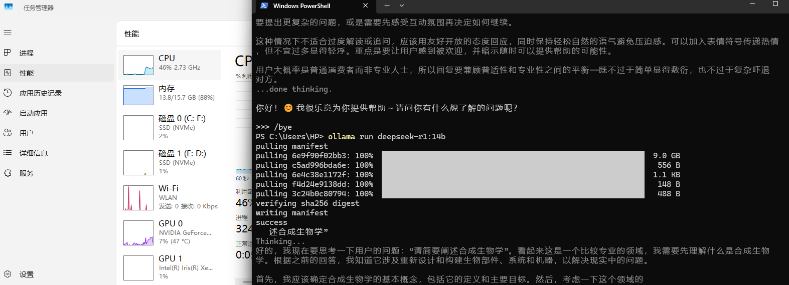 可以在本教程所使用的机器上运行,受限于NVIDIA RTX3050Ti GPU算力,在运行DeepseekR1:14b版本时略显吃力。内存占用如下图任务管理器所示,需要约11G内存。