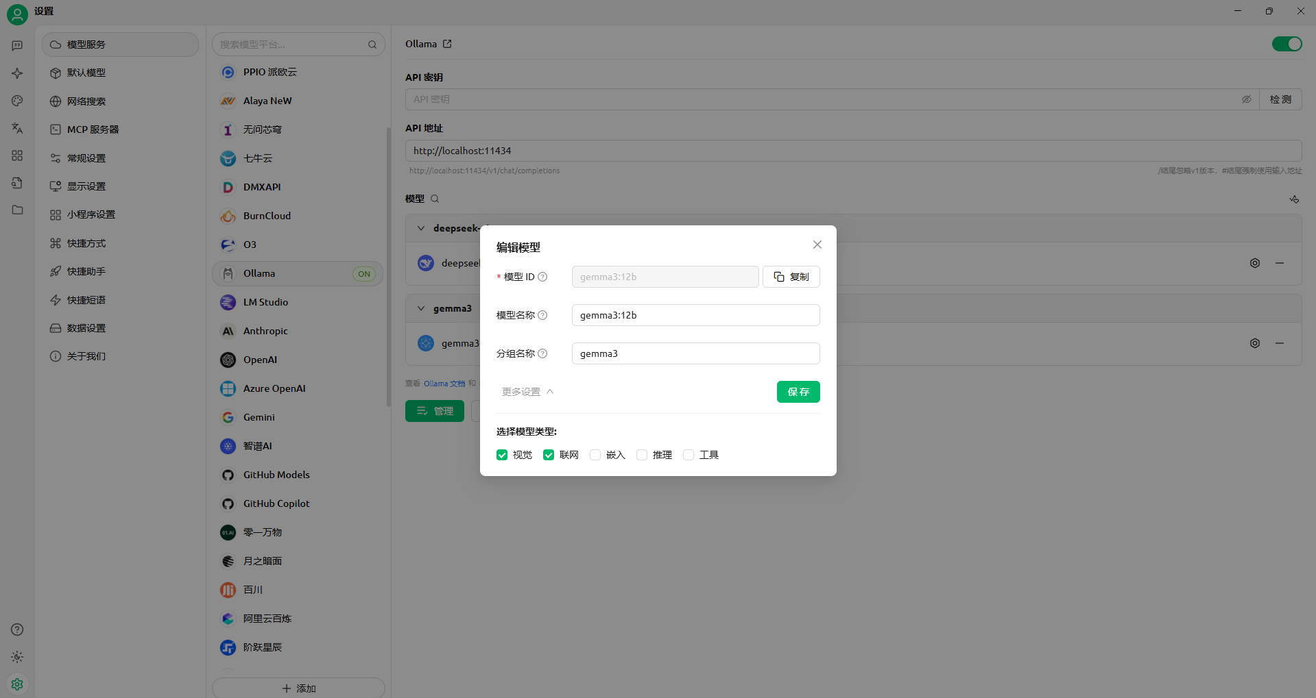 这里我们使用Google公司的gemma模型,还可以在添加AI后,点击右侧螺母形状的设置按钮,开启图片识别,联网搜索功能