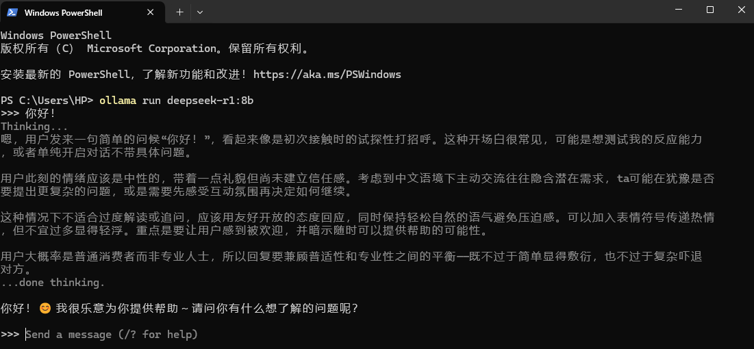 输入 /bye 退出对话到此为止,你已经拥有自己的DeepseekR1:8B大模型了。