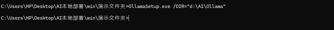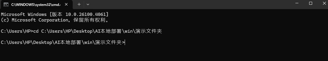 然后再CMD窗口输入cd C:\Users\HP\Desktop\AI本地部署\win\演示文件夹这样就进入了该目录