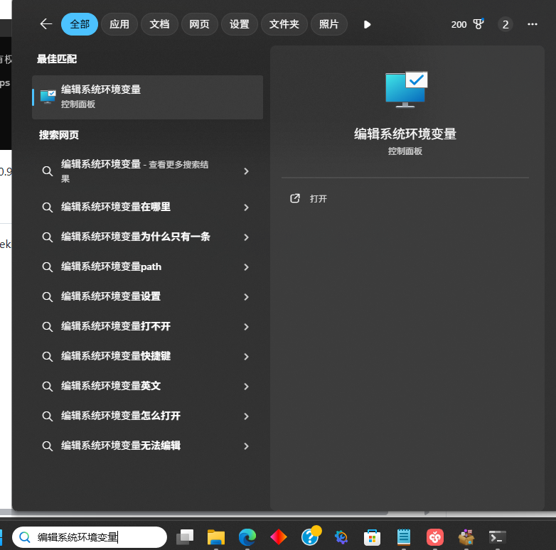 按下 ”Windows徽标键+S“ 快捷打开搜索栏,如下图所示,搜索”编辑系统环境变量“