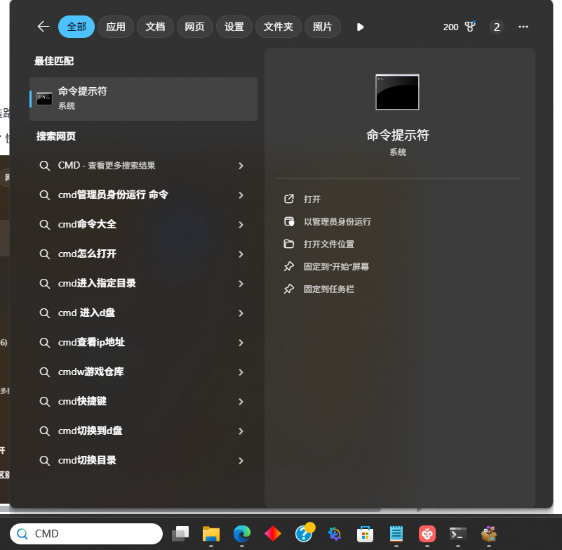 首先,我们打开CMD,按下 ”Windows徽标键+S“ 快捷打开搜索栏,如下图所示,搜索CMD